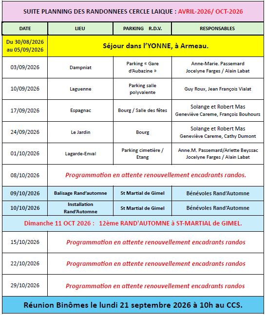 DES RANDONNEES CERCLE LAIQUE : AVRIL-2026 / OCT-2026